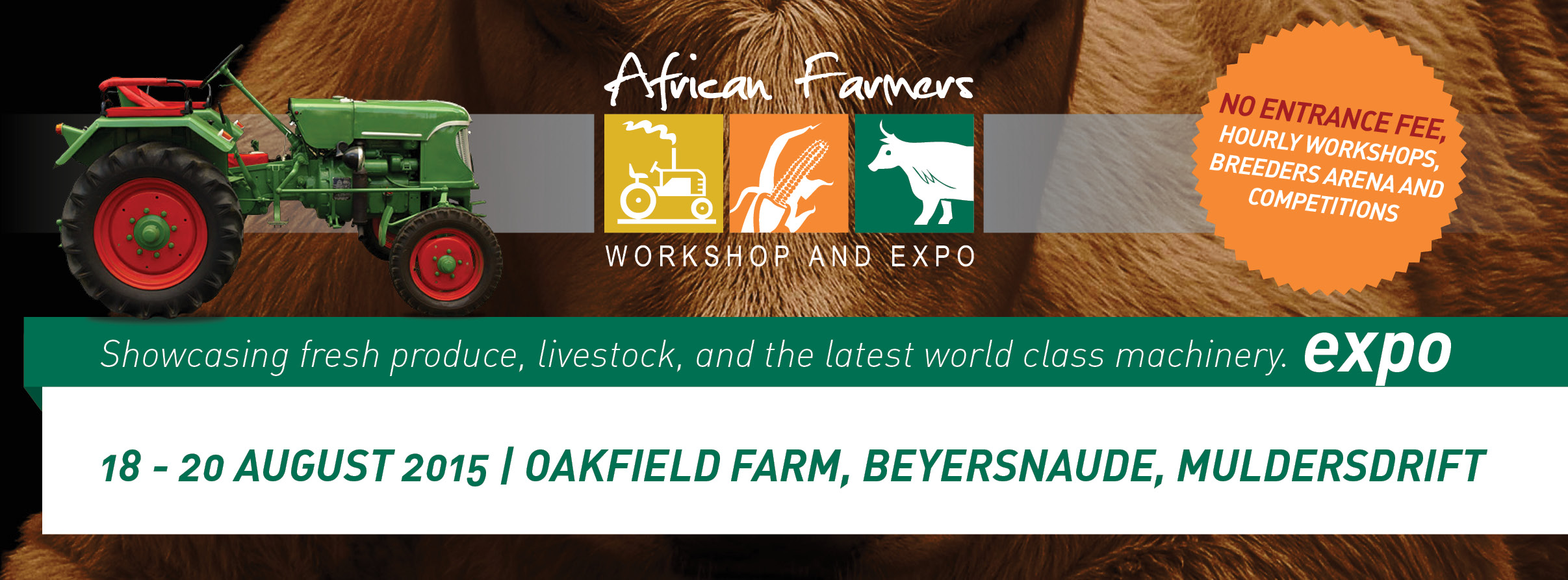 Hosted at Oakfield farm, Beyersnaude, Muldersdrift. The African Farmers Workshop and Expo is a 5 year old interactive agricultural show, with the objectives of promoting and empowering the emerging African farmers of South Africa, facilitating their training, skills development and showcasing opportunities within the agricultural sector. It also provides a unique opportunity in ensuring that the private sector interacts with the public sector in the efforts of empowering and upskilling emerging African farmers.